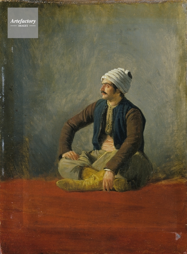 | キャプション | A seated man wearing a white turban, a blue waistcoat over a brown-sleeved tunic, a pink sash, grey trousers and leather boots. | 制限事項 | ||