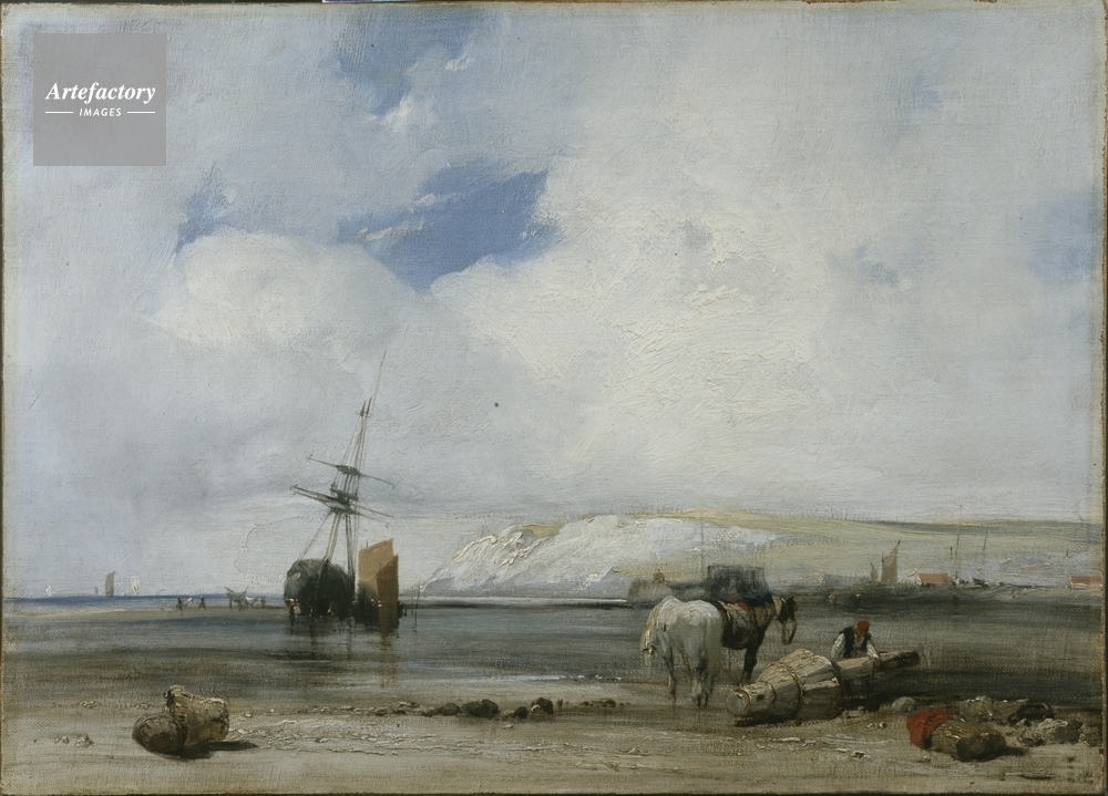 | キャプション | A beach with a man and two horses in the right-foreground. In the mid-distance boats are grounded on the wet sand and in the distance are white cliffs. Probably a scene in Normandy rather than Picardy. | 制限事項 | ||