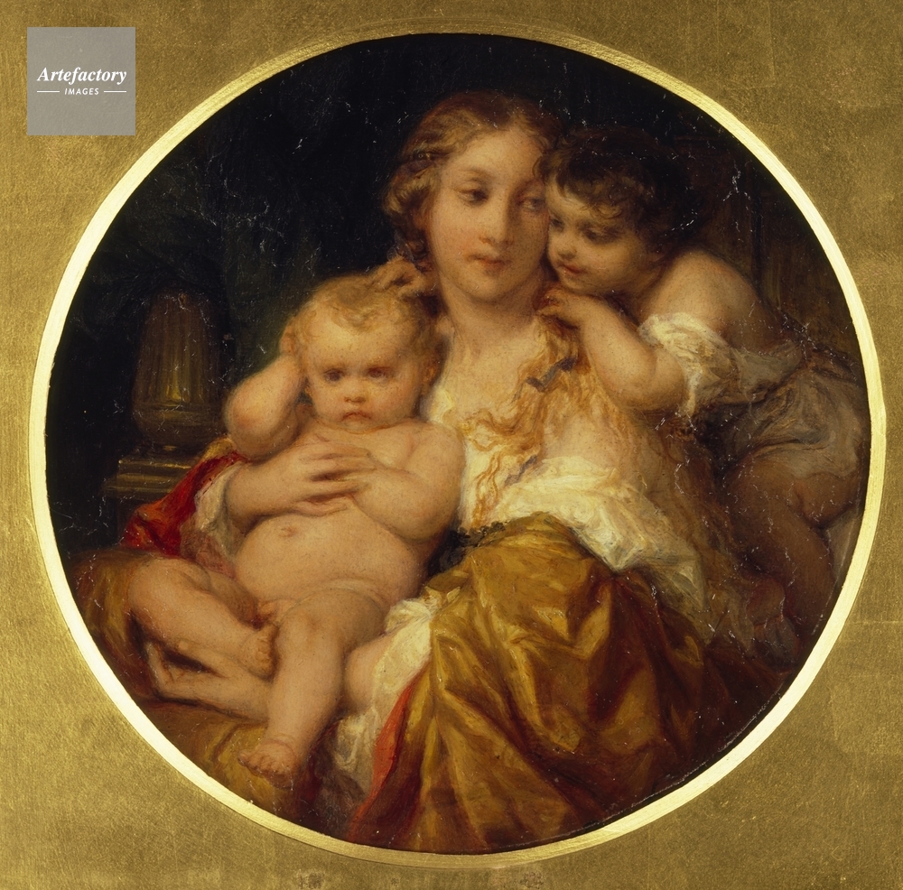 Circular painting depicting a contented mother