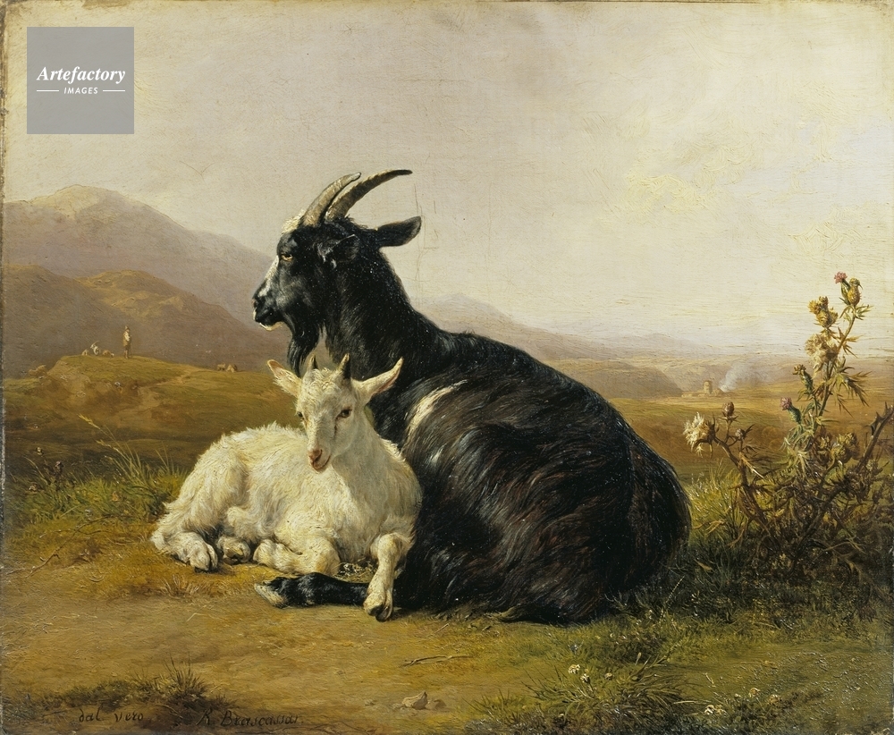 | キャプション | A black goat with a white kid lying in a landscape. Mountains in the background. The inscription indicates that it is a study from life. It was probably painted at Millau (Aveyron) in France. | 制限事項 | ||