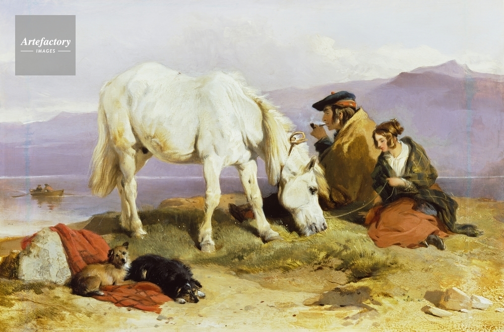 | キャプション | A white horse, two dogs lying on a red rug, and two figures in a Highland landscape. The man wears a beige cloak, and the woman a rust-brown skirt and a dark plaid shawl. | 制限事項 | ||
