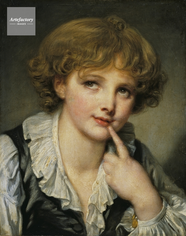 | キャプション | Half-length figure of a boy with chestnut hair and brown eyes looking up to the left. He wears a grey jacket over a white blouse and is pointing his left forefinger to his mouth. | 制限事項 | ||