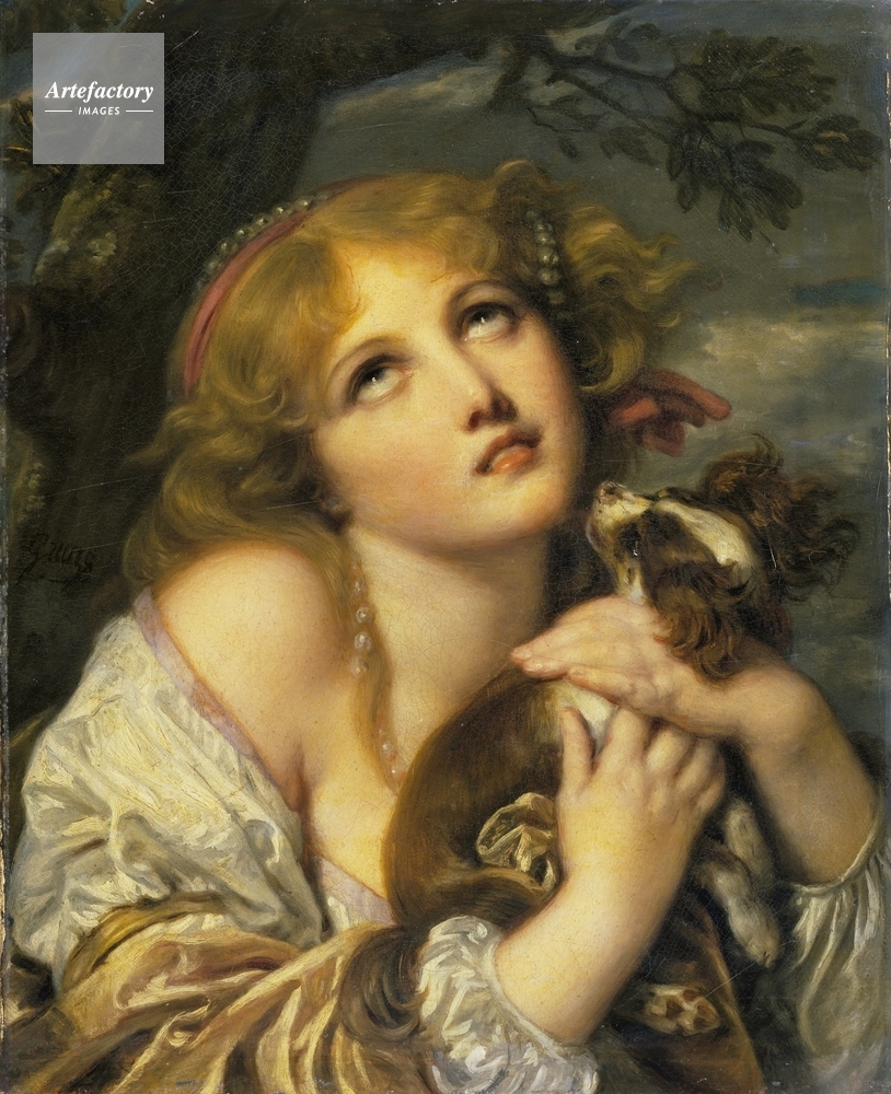 | キャプション | Half-length figure of a fair-haired girl with a dog. Her hair is dressed with a plum-coloured ribbon set with pearls, and she wears a white dress with purple trimming and yellow drapery. | 制限事項 | ||