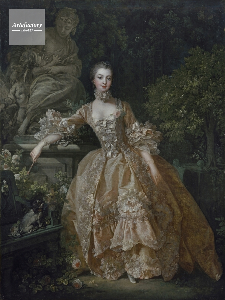 | キャプション | Full-length portrait of Madame de Pompadour in a pink taffeta dress. She has a rose in her corsage. A black and white spaniel sits on the green bench on the left. A stone statue portraying Friendship and Love is on the top left. | 制限事項 | ||