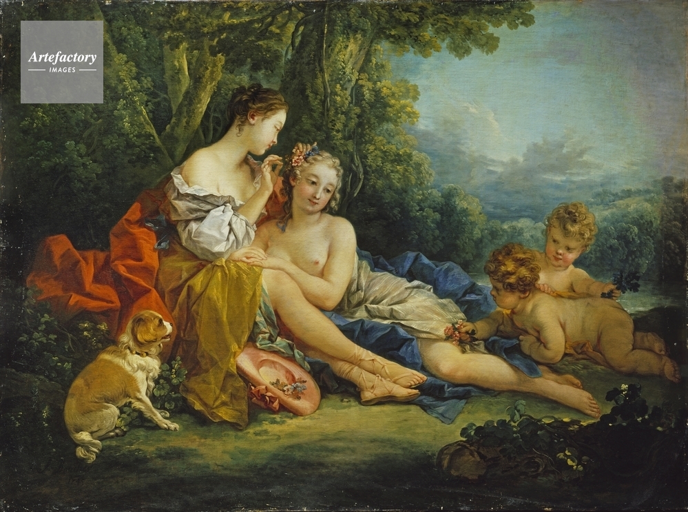 | キャプション | Pendant to P447. A seated shepherdess arranges flowers in the hair of her reclining companion. Amours offer flowers as a spaniel looks on, with a river landscape beyond. | 制限事項 | ||