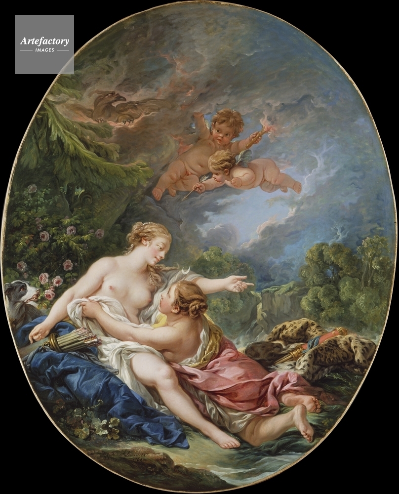 | キャプション | The seated Callisto is embraced by Jupiter transformed into Diana. His symbol, the eagle, and amours with a torch and arrow of love hover above. | 制限事項 | ||