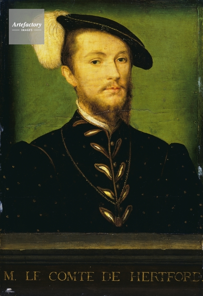| キャプション | Half-length portrait of d'Étampes (born 1505). He is wearing a plumed cap, a black costume decorated with pearls, and there is a locket hanging from a gold chain. A false inscription 'M. LE COMTE DE HERTFORD.' has been added below. | 制限事項 | ||