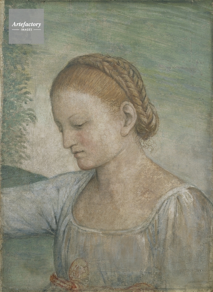 | キャプション | A head and shoulders figure of a girl, her right arm raised, with fair hair swept up away from her face, dressed in a white dress with a red girdle. From the Villa Pelucca, near Monza. See also P526. | 制限事項 | ||