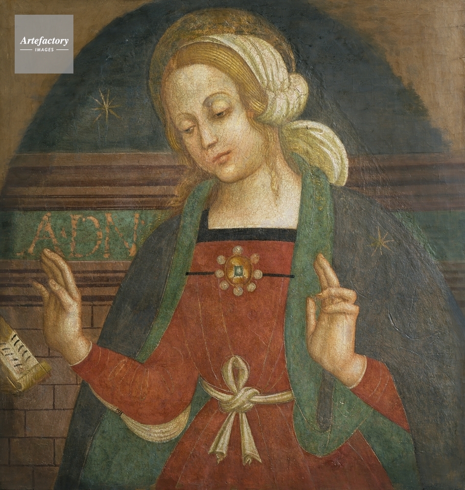 | キャプション | The Virgin Mary wearing a red dress with a black-lined collar and white girdle, a grey cloak with a green lining and a white head-dress. She has the first two fingers of her left hand raised in blessing. | 制限事項 | ||