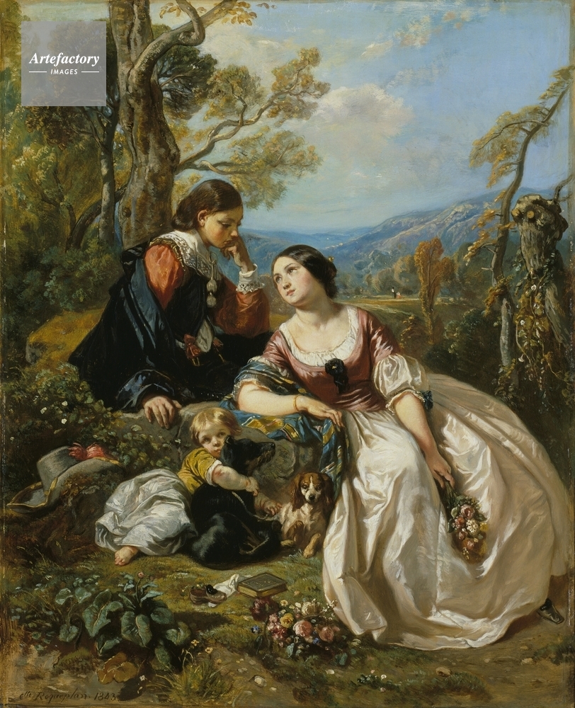 | キャプション | Three figures in seventeenth-century dress in a landscape. The woman on the right wears a purple bodice and white skirt. In the centre a child holds a black dog and on the right the youth leans towards the woman resting his chin on his left hand. | 制限事項 | ||