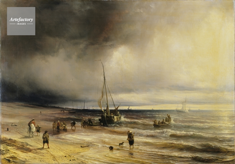 | キャプション | The Dutch coast with figures on the beach and several boats scattered along the shore. The sea is rough and dark clouds gather to the left-hand side of the sky. | 制限事項 | ||
