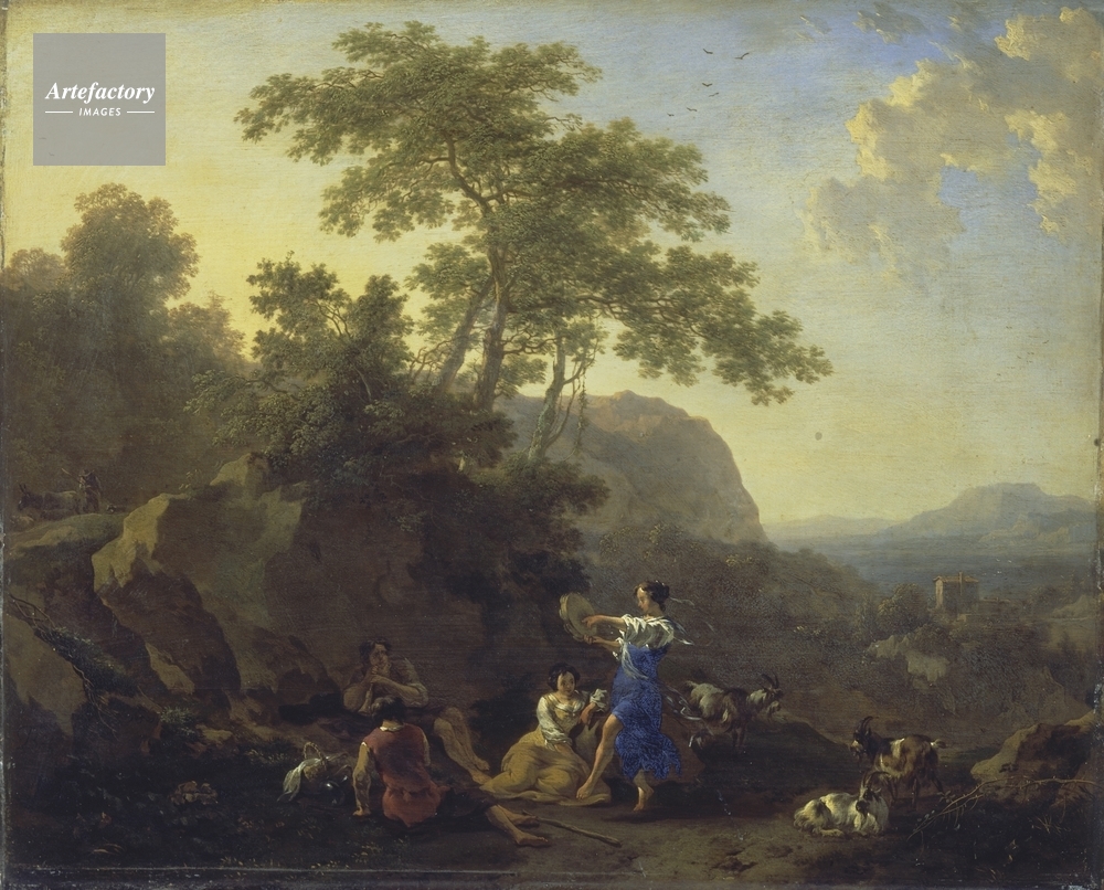 | キャプション | In an extensive Italianate landscape a shepherdess dances and plays the tambourine as other shepherdesses, seated on the ground with their flock of goats, look on. | 制限事項 | ||