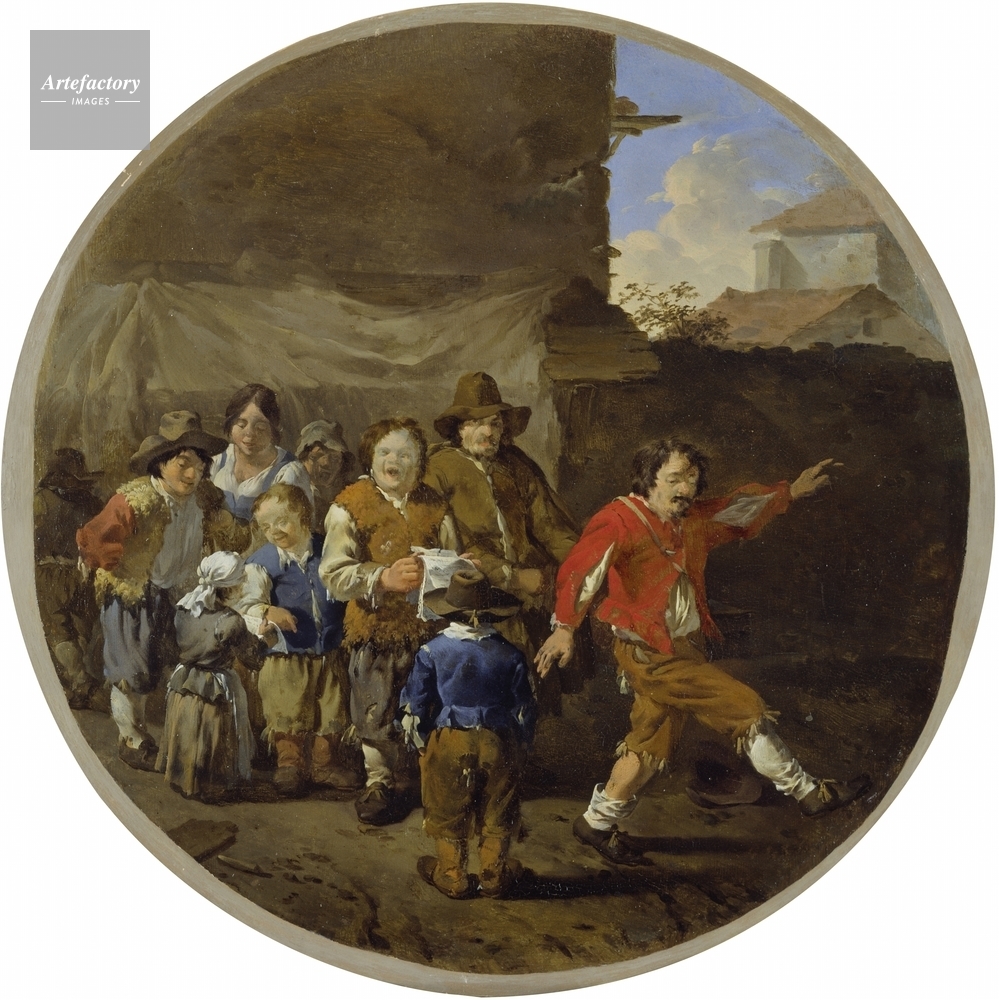 | キャプション | In front of a wall covered with a sheet a group of strolling players sing as another of their company dances in the street. | 制限事項 | ||