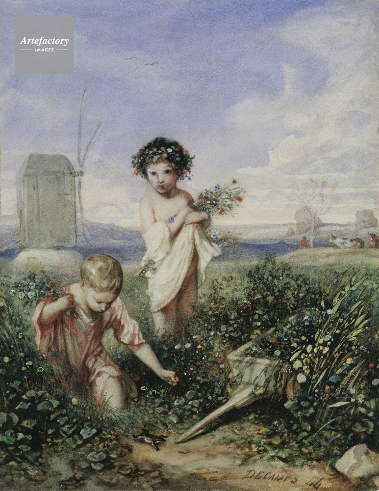 | キャプション | Two children gathering flowers in a landscape. A windmill is on the left. The child on the left is in red and watches a frog pass the wheelbarrow on the right. Perhaps an allegory of Spring. Signed 'DECAMPS 44' on the bottom right. | 制限事項 | ||