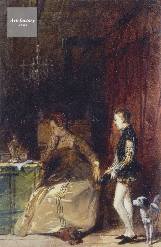 | キャプション | A lady in a yellow skirt and red cap with her page who wears a black doublet and white hose, a dog by his side. Red curtains are in the background. | 制限事項 | ||