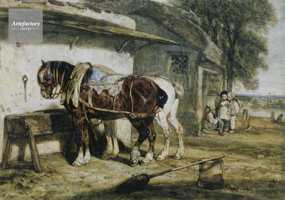 | キャプション | Two horses, one brown, one white, at a trough. A bucket and broom are on the ground in the foreground. Three children are in the background. | 制限事項 | ||