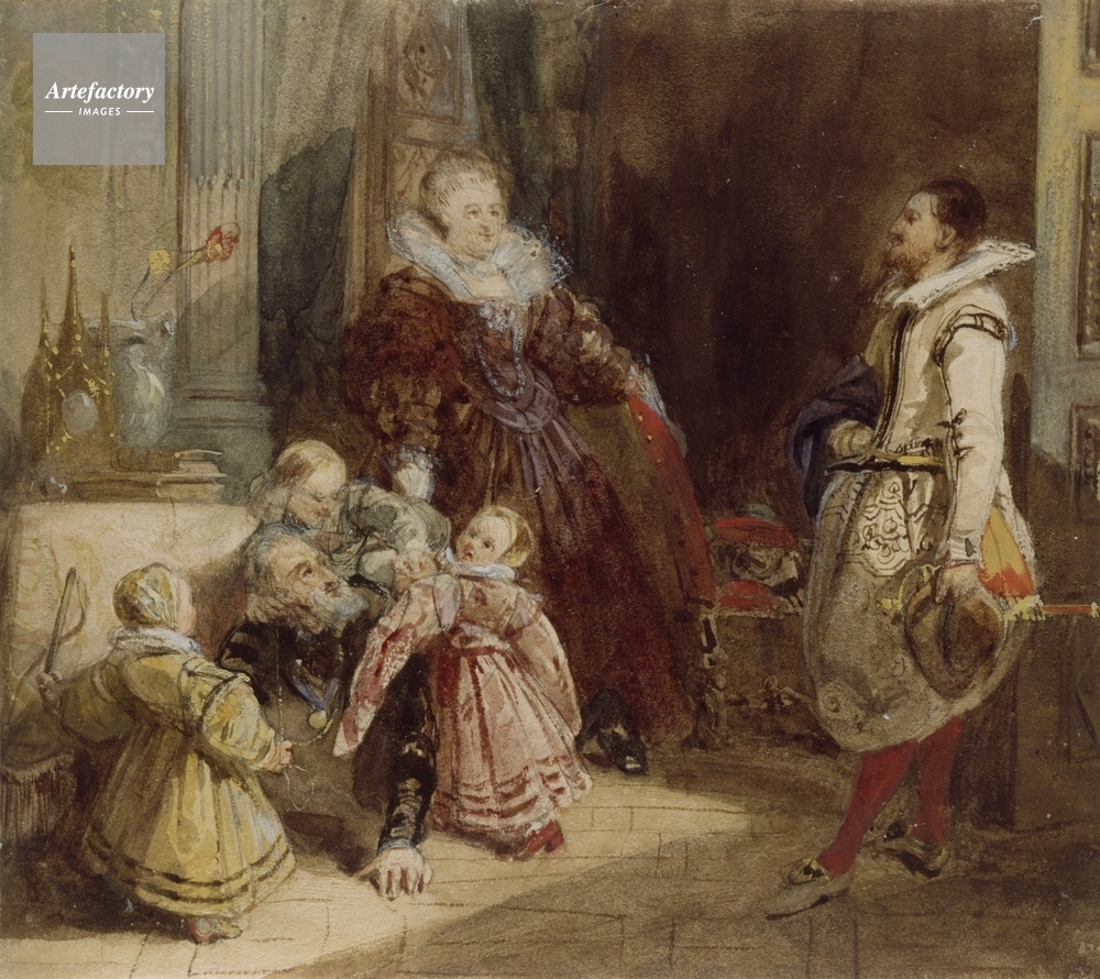 | キャプション | Henri IV, King of France (1553-1610), playing with his children in front of the Spanish Ambassador who is surprised to find him in such an undignified position.Queen Marie de Medicis behind. See also P351. | 制限事項 | ||