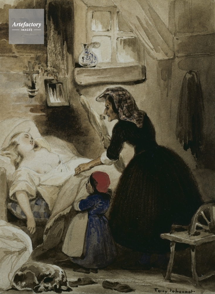 | キャプション | An elderly woman in a black dress leans over the sleeping figure of a fair-haired woman in white; a small figure next to them wears a red hat and a blue skirt. An illustration to an (unidentified) literary work. | 制限事項 | ||