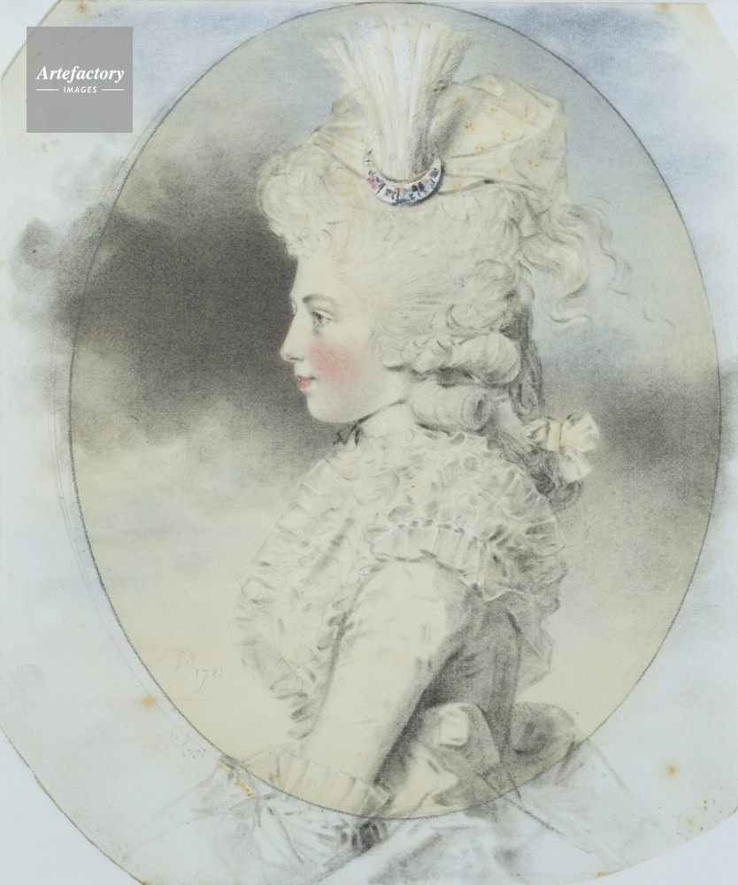 | キャプション | Half-length oval portrait of Isabella, 2nd Marchioness of Hertford as Lady Beauchamp in profile to the left. She has powdered hair dressed with an egret, and she wears a white ruffled kerchief over a white dress. | 制限事項 | ||