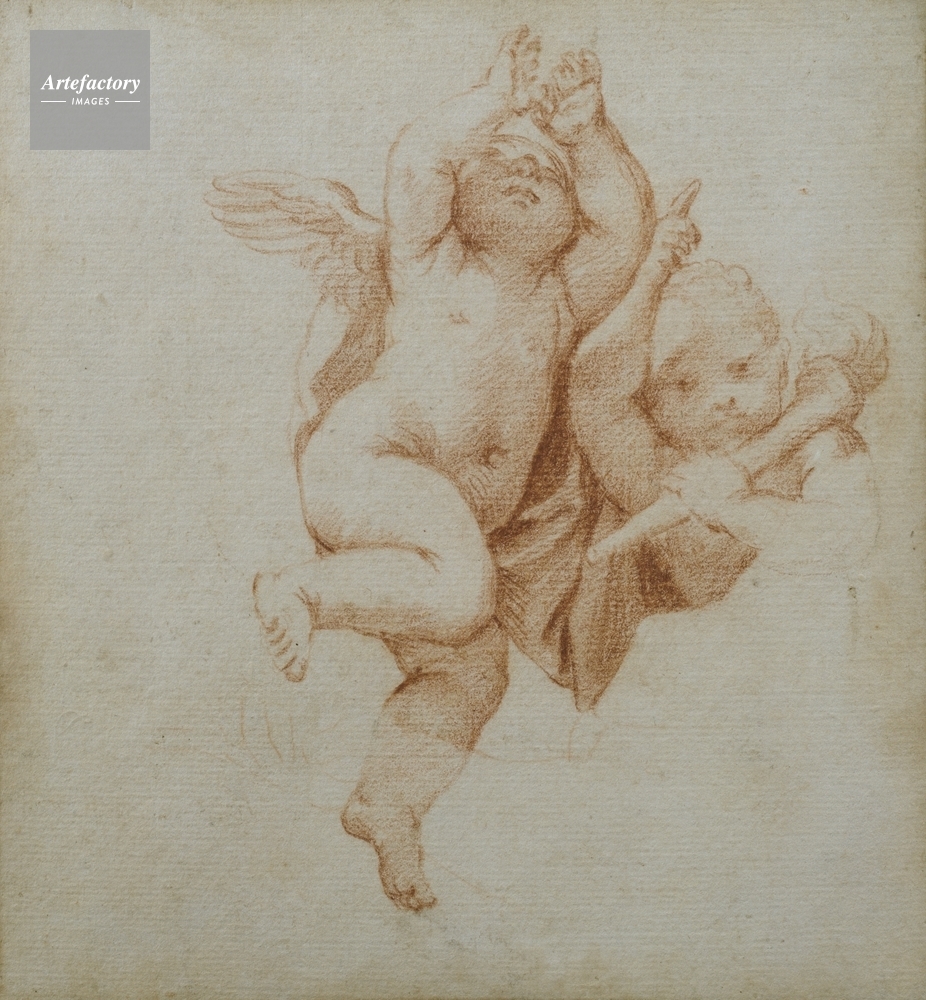 キャプション Two Amorini with wings. The figure on the left has both arms raised upwards, and the figure on the right holds a torch in one hand and points upwards with the other. After a detail in Domenichino's Saint John in Sant'Andrea della Valle, Rome. 制限事項