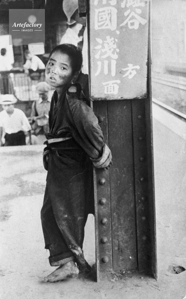 | キャプション | 1946年(昭和21年)、東京駅中央線のホームでただ一人、屋根の支柱にもたれてたたずむ戦災孤児 | 制限事項 | ||