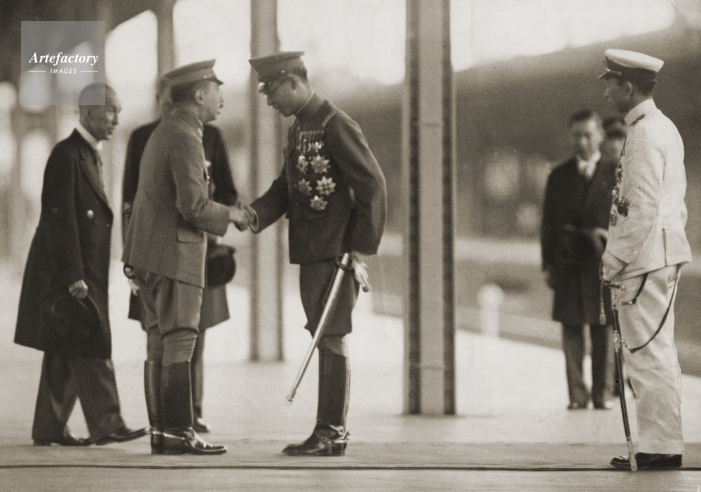 | キャプション | 満州国皇帝と5年ぶりに対面、握手を交わす昭和天皇(左から2人目)。右端は高松宮 | 制限事項 | ||