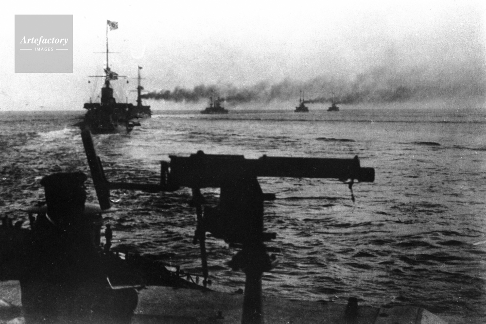 | キャプション | 1905年(明治38年)6月23日の薄暮、日本海海戦に勝利し、警戒しながら帰航中の日本海軍主力艦隊 | 制限事項 | ||