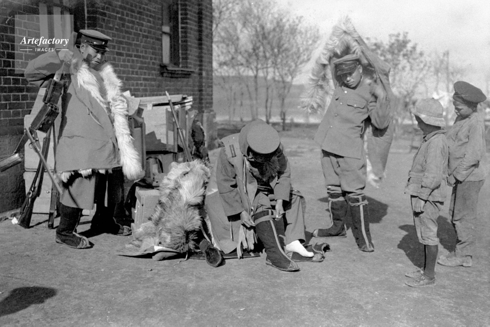 | キャプション | 大正7年、日本がロシア革命に干渉するため連合国の一員としてシベリアに出兵した当時の極東ロシア。支給された防寒具を身につけてみる兵士。 | 制限事項 | ||