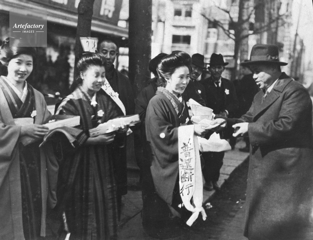 | キャプション | 1922年2月、「普選断行」のたすきを手に、運動資金つくりのマークを売る婦人たち(作間耕逸代議士の夫人と令嬢)。 | 制限事項 | ||