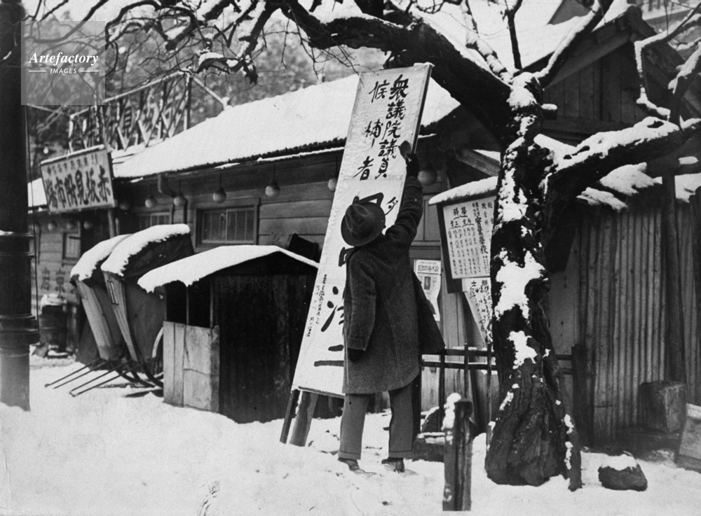 | キャプション | 昭和3年2月、普通選挙法による初の衆議院議員選挙(第16回総選挙)が行われた。有権者層が広がり候補者は自己の売り込みに懸命、雪の被った立て看板を掃除する運動員。 | 制限事項 | ||