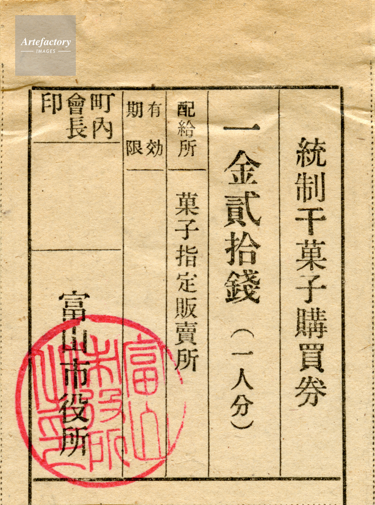 | 作品タイトル | 1942年 切符制度 統制干菓子購買券 富山市役所 | モデルリリース | なし | |