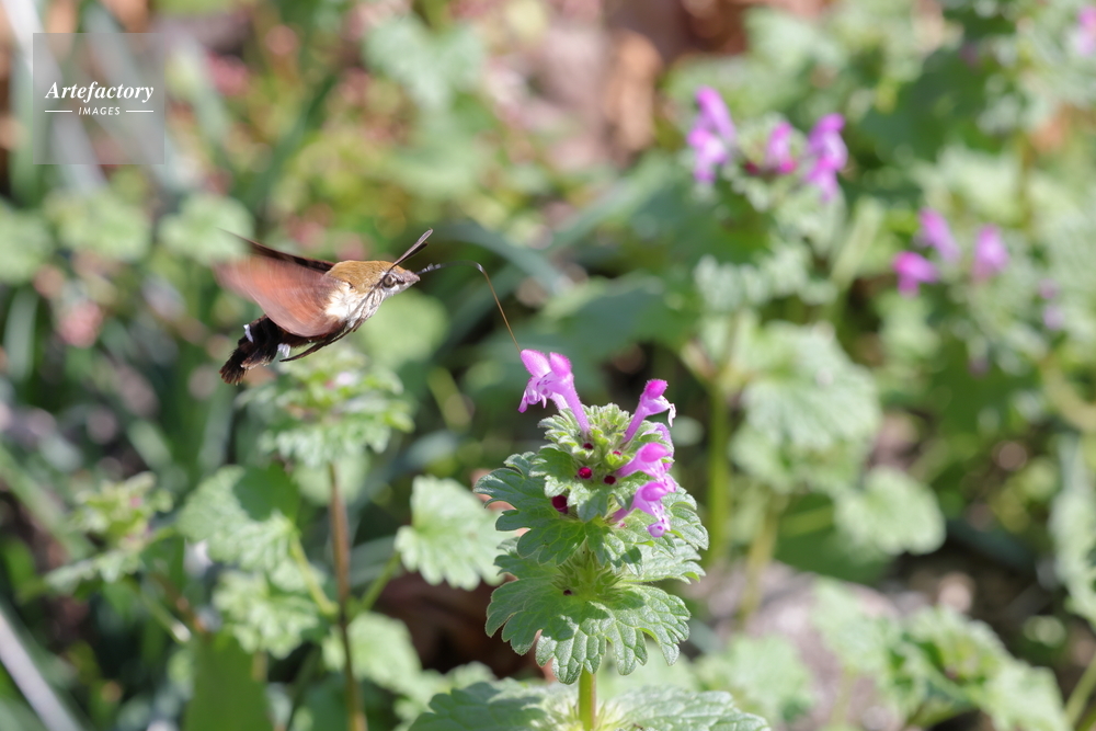 | 作品タイトル | 飛びながらホトケノザの蜜を吸うヒメクロホウジャク | モデルリリース | なし | |