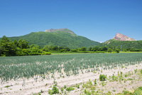 有珠山(左)と昭和新山(右)とタマネギ畑