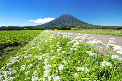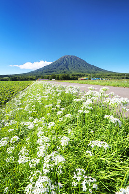 羊蹄山とニラの花と道